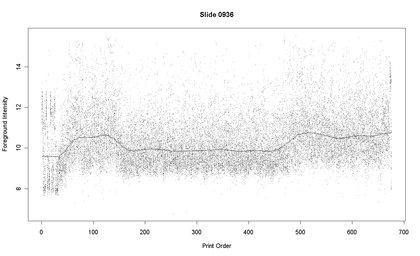 Although every effort is made to ensure that the DNA use to print spots on the array is of uniformly high purity, some variations in purity will inevitably occur. Variation will DNA purity will translate into variation in the intensity of the spots after hybridization and scanning. Consider results for the following array printed at the AGRF and hybridized at the Walter and Eliza Hall Institute of Medical Research. The graph plots the foreground intensity for each spot against print-order. Each intensity of the average of the red and green intensities to log-base-2.