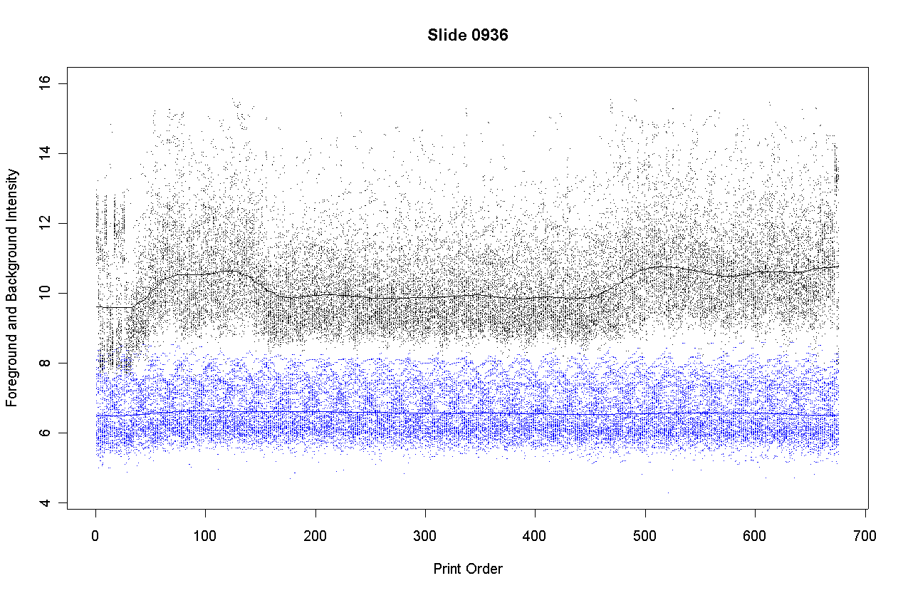 The plot shows the foreground intensities in black and background intensities in blue. Background is estimated by morphR and morphG (morphological opening and closing in Spot). The plot shows that the background intensities are nearly constant with respect to print-order. This is to be expected because DNA purity cannot affect the intensity of those parts of the slide surface where no DNA has been immobilized.