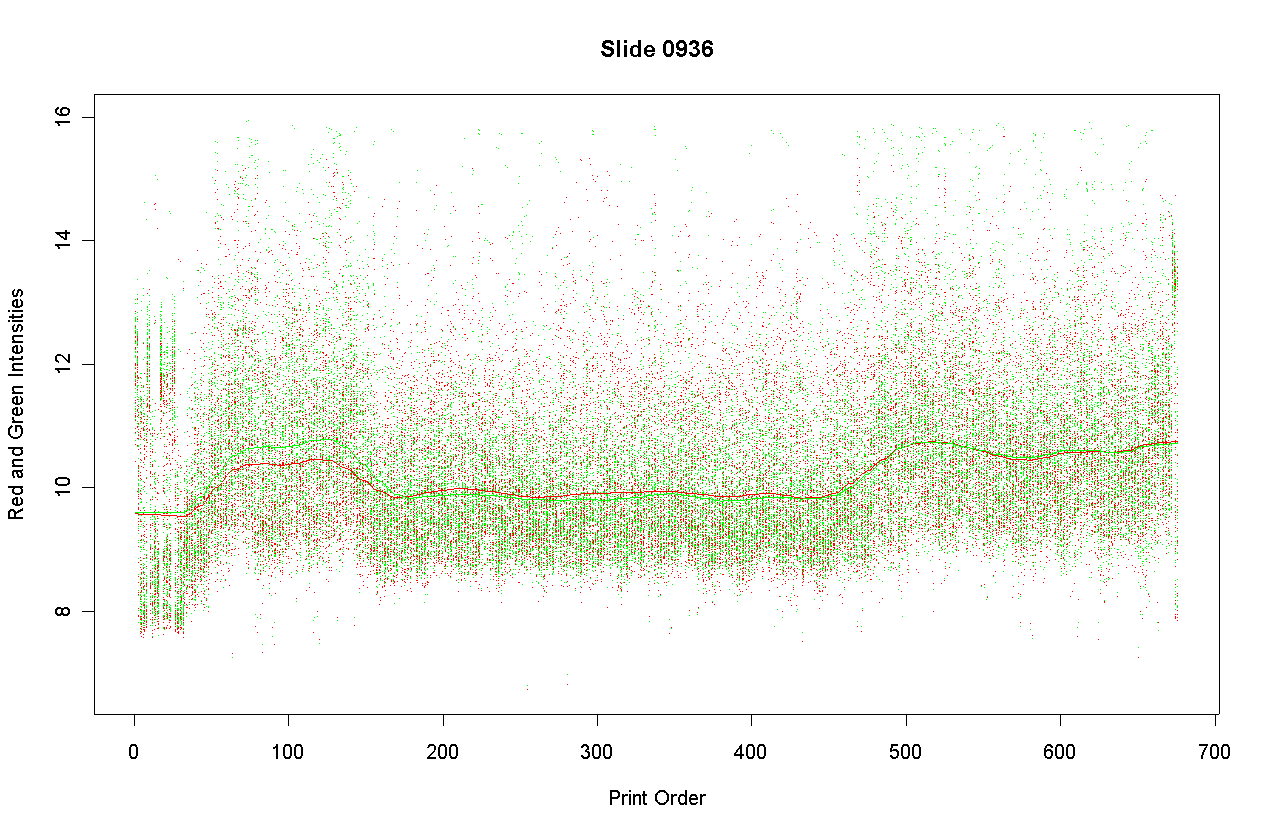 This slide showed the greatest interaction between dye and print-order of any of the six slides in the experimental run. The other five slides showed essentially parallel print-order effects on both red and green intensities.