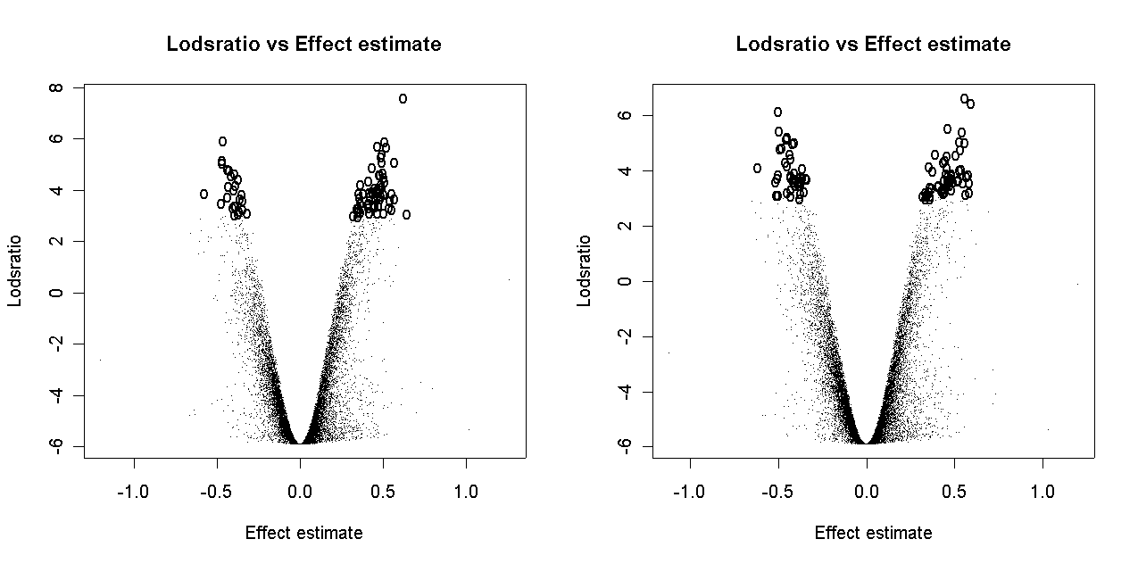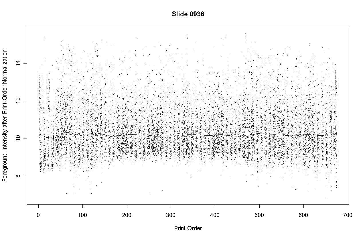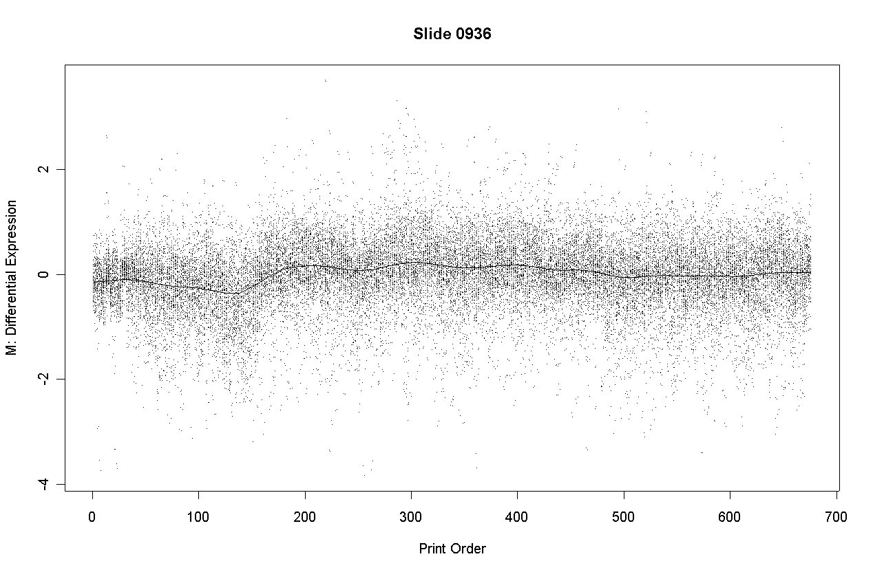 Consider the smooth loess curve in Figure 1 above. The print-order normalization procedure is to subtract this loess curve from the red and green log-intensities. Denote the print-order for each spot as t and the loess curve as lo(t). Let Af = log2(Rf*Gf)/2, where Rf and Gf are the red and green foreground intensities, be the foreground intensity for each spot. The loess curve is obtained from robust local constant regression of Af on t with span = 0.1. Technically this is loess regression with polynomial degree = 0. Denote the average value of the loess curve by ave lo(t). Let k(t) = lo(t) - ave lo(t). The print-order normalization is to replace Rf and Gf with
